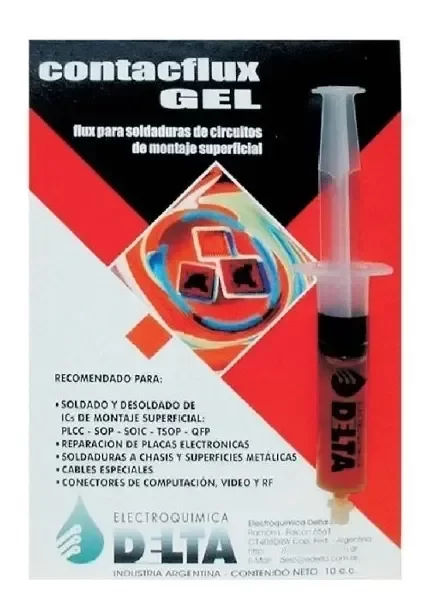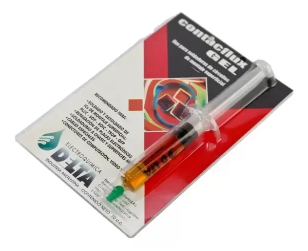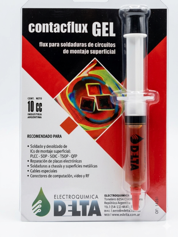 El Contact Flux Gel de Electroquímica Delta es un fundente en gel de alta calidad, especialmente formulado para trabajos de soldadura y desoldadura en circuitos de montaje superficial (SMD). Su presentación en jeringa de 10 cc permite una aplicación precisa, limpia y sin desperdicios, ideal tanto para técnicos como para aficionados a la electrónica.