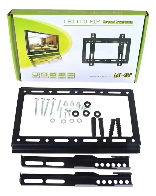PRODUCTO: El soporte para TV de pantalla plana Megalite HT-0027. Diseñado para pantallas de entre 14 y 42 pulgadas, este soporte es compatible con tecnologías LED, LCD, QLED, OLED y Plasma, garantizando versatilidad para diferentes modelos de televisores.