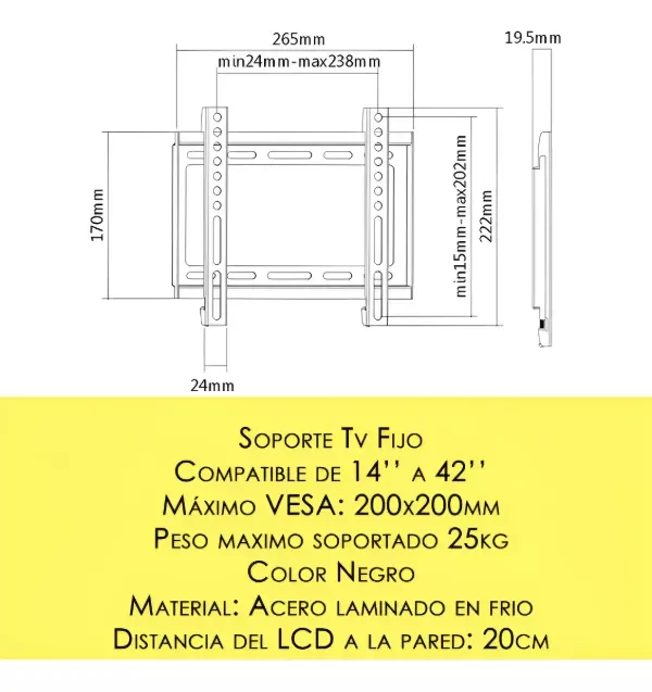 Con un acabado en color negro, se integra perfectamente en cualquier ambiente, aportando un toque moderno. Su diseño fijo asegura que tu televisor permanezca en la posición deseada, mientras que su capacidad de soportar hasta 25 kg brinda tranquilidad y estabilidad. Este soporte se monta fácilmente en la pared, optimizando el espacio y mejorando la experiencia visual. Con estándares VESA de 75×75, 100×100 y 200×200.